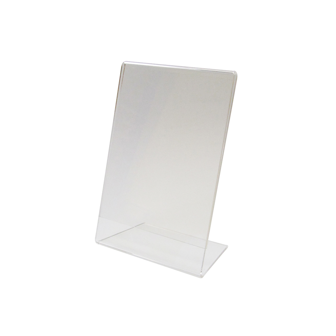 Transparante kaarthouder of folderstandaard van acryl in een L-vorm.